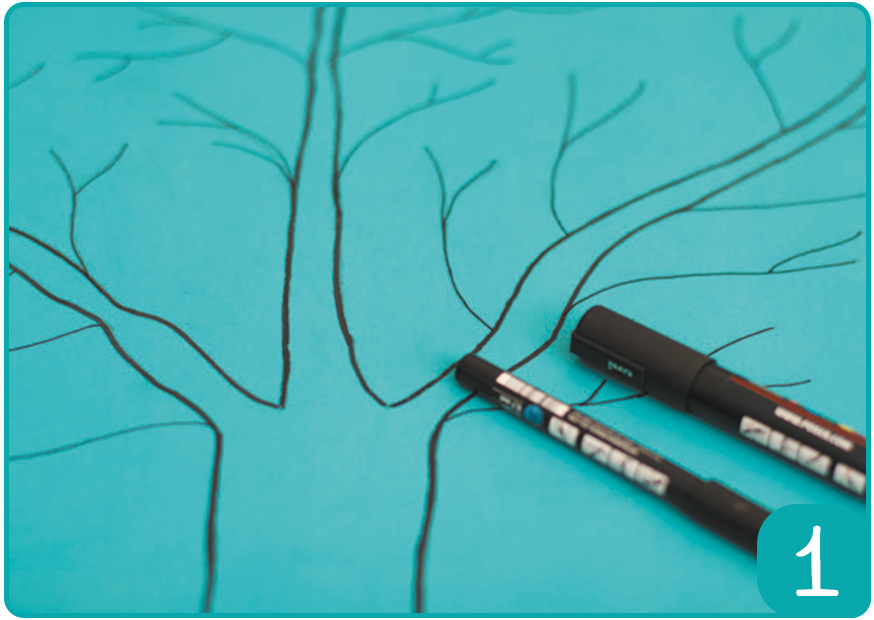 Etape 1 : Peindre la plaque de carton d’une couleur vive à l’aide d’un rouleau. Passer une deuxième couche si nécessaire et laisser sécher. Dessiner au crayon à papier la silhouette d’un arbre sans feuille. Repasser les contours au marqueur noir. Peindre en noir le tronc et les branches principales au pinceau. Laisser sécher.