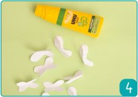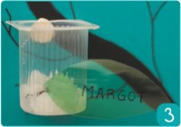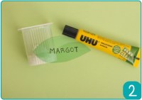 Etape 2 : Pour chaque enfant, prendre un pot de yaourt transparent, couper un bord, remplir le fond de coton, arroser légèrement, déposer quelques lentilles. Dans des bouteilles en plastique, découper des formes de feuille. Ecrire au marqueur le prénom des enfants. Coller l’une des extrémités de la feuille sur le pot avec une colle tous matériaux.