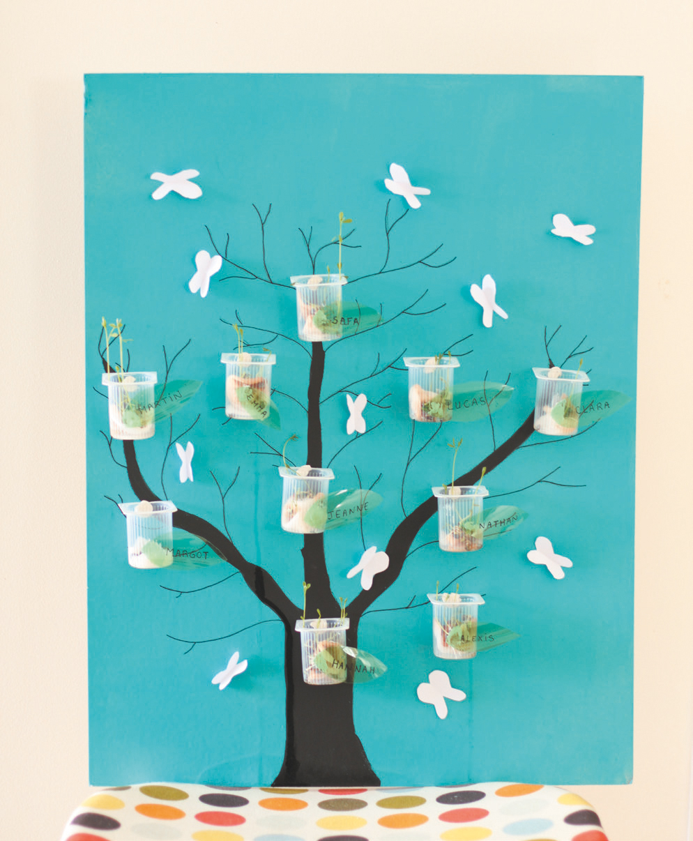 Etape 3 : Fixer l’ensemble sur l’arbre à l’aide de fixations adhésives. Les enfants pourront ainsi enlever et remettre le pot facilement pour observer la germination et arroser leur pot.