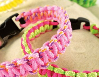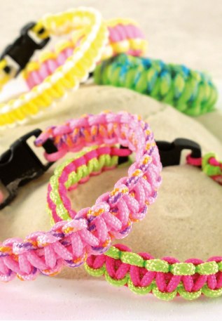 Faire une boucle dans le clip (femelle) et passer la corde. Serrer et passer les fils dans l’autre clip (mâle). Ajuster selon le tour du poignet. Commencer les nœuds à partir du clip mâle.
