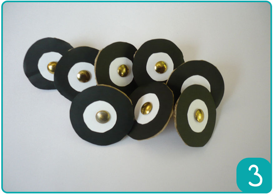 Etape 2 : Tracez des cercles de 2cm de diamètre sur du carton à l’aide du compas afin de réaliser les roues, puis découpez-les. Découpez des cercles sur une feuille noire de la même taille que les cercles en carton et des plus petits sur une feuille blanche pour les enjoliveurs. Collez le tout avec la colle en stick.