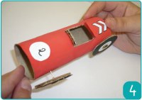 Etape 4 : Découpez un petit rond en carton pour faire le volant et un rectangle pour le dossier du siège. Décorez le volant avec une feuille blanche et le marqueur noir. Puis, collez les accessoires (volant, numéro, décoration). Pour finir, placez votre figurine à l’intérieur.