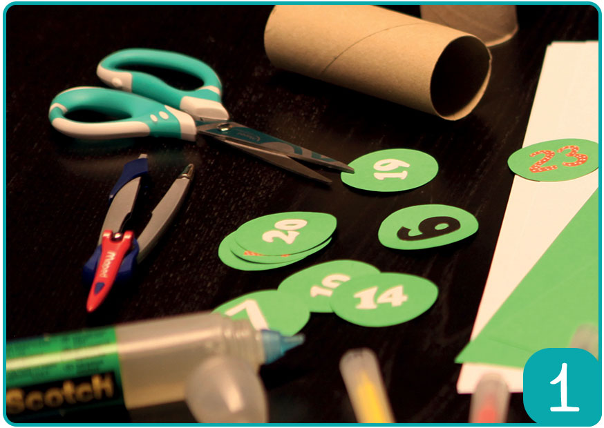 Etape 1 : Pour commencer, découper 24 ronds de couleur du même diamètre que les rouleaux, puis les numéroter de 1 à 24 avec de beaux chiffres dessinés au feutre.