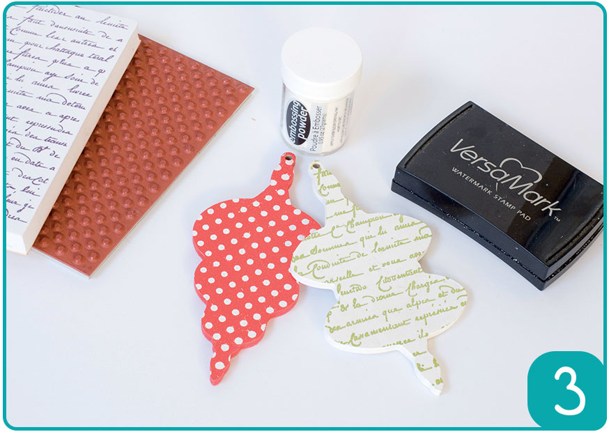 Etape 3 : Encrer le tampon. Tamponner les supports. Verser la poudre à embosser sur l’empreinte. Retirer l’excédent. Chauffer l’empreinte recouverte de poudre à embosser avec le pistolet à air chaud jusqu’à ce que la poudre ait bien fondu. Laisser refroidir.