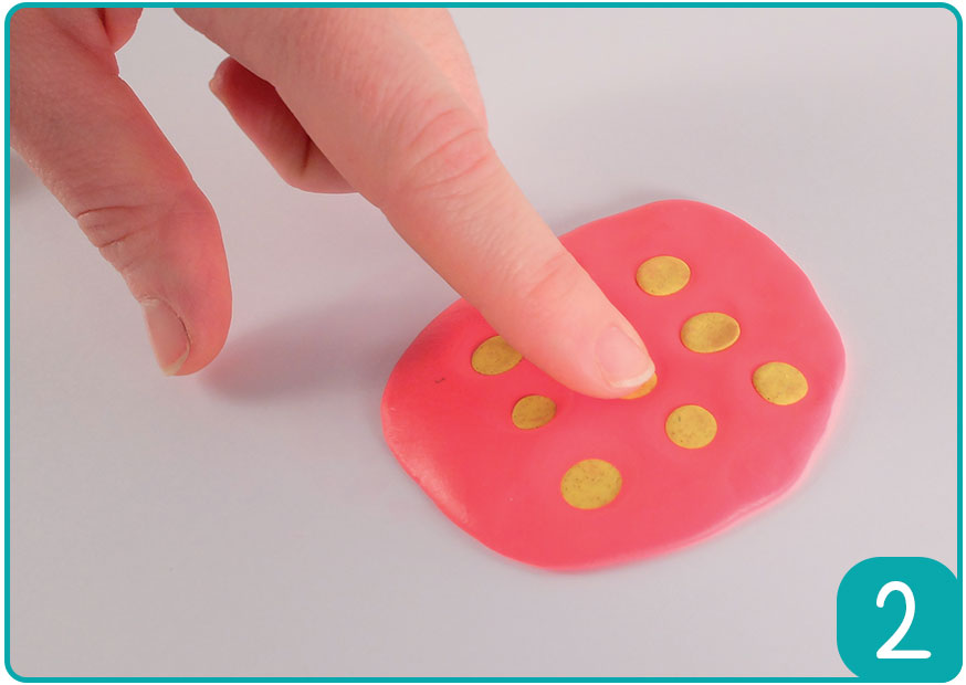 Etape 2 : Poser des petites boules d’une autre couleur sur la base. Aplatir les petites boules avec le doigt.