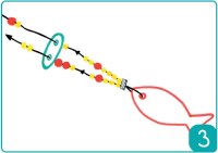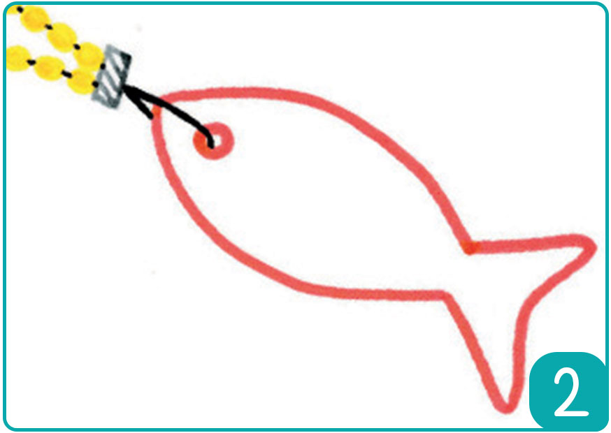Etape 2 : Enfiler le poisson par son œil sur le fil câblé et le laisser glisser au milieu. Passer les 2 extrémités du fil dans une perle à écraser et faire glisser celle-ci juste au-dessus du poisson. L’écraser avec la pince plate.