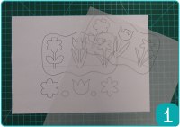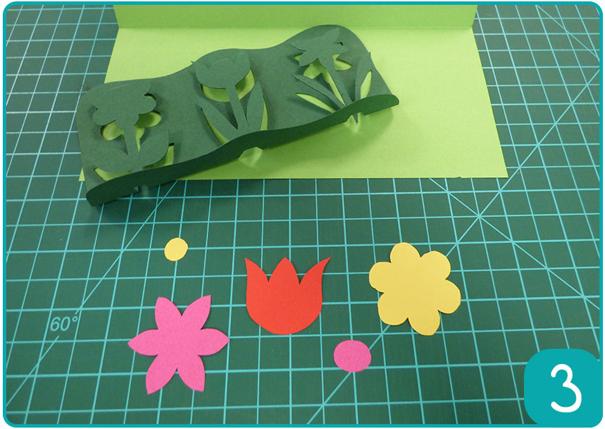 Etape 1 : Télécharger le pdf pour obtenir le gabarit. Découper un rectangle de 21 x 20 cm sur la feuille vert pré. Le plier en deux. Pour que la feuille ne se fissure pas lors du pliage, appuyer avec le dos du couteau. A l’aide du papier calque, décalquer le gabarit du trio de fleurs sur la feuille verte.
