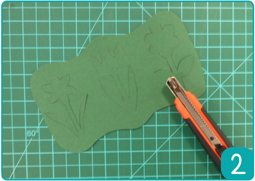 Etape 2 : Pour découper les contours du trio de fleurs, utiliser le cutter. Prendre soin de ne pas découper les lignes de pointillés. Faire des plis sur les pointillés. Attention : les points doivent êtres pliés vers l’extérieur et les tirets vers l’intérieur.
