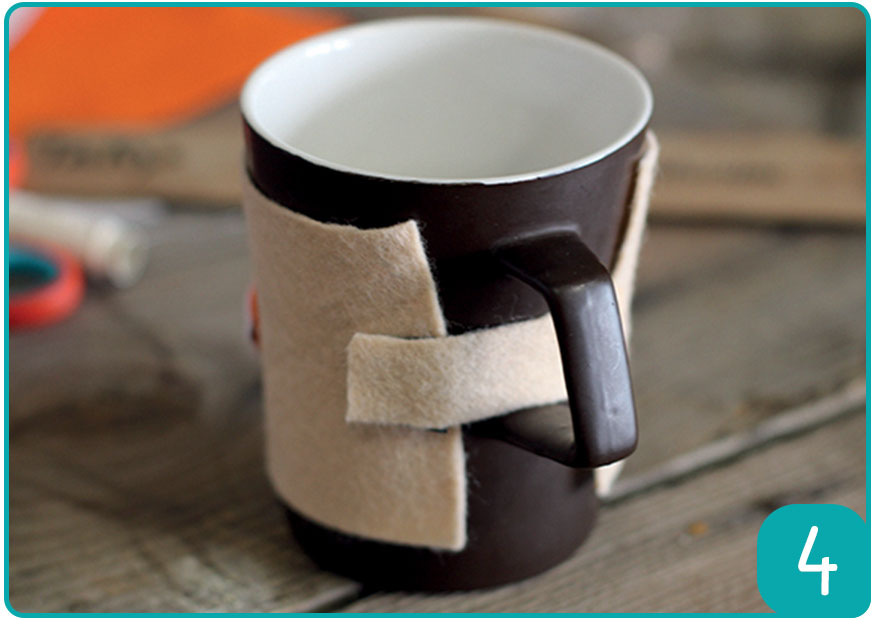 Etape 3 : Mesurer la tasse et couper un morceau de feutrine rectangulaire qui recouvrira presque entièrement la tasse, en laissant découvert un centimètre en haut et en bas. Coudre le renard sur la bande. Couper une bande de feutrine pour relier les deux extrémités du couvre-tasse. Coudre la bande sur un côté et coller un morceau de velcro au bout de la bande. Coller l’autre morceau de velcro sur l’autre côté du couvre-tasse, pour pouvoir le mettre et le retirer à tout moment.