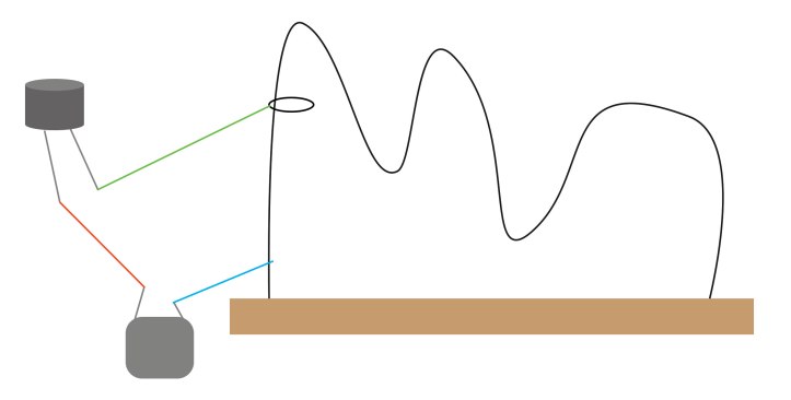 • Construction : entourer chaque extrémité du fil de fer rigide autour de chaque vis. Tordre le fil de fer et former un parcours simple et visser les extrémités à la planche de bois, à l’aide du tournevis. Relier avec un câble de liaison (bleu sur le schéma) de la borne (-) de la pile au fil de fer. Puis, connecter avec un autre câble de liaison (rouge sur le schéma) la borne (+) de la pile au fil rouge du buzzer, et enfin continuer avec le dernier câble de liaison vert du fil noir du buzzer à un trombone.