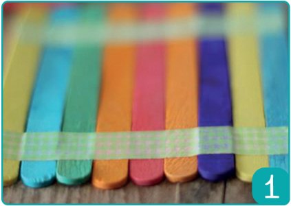 Etape 1 : Choisir 10 bâtons de couleurs différentes. Les maintenir ensemble à la même hauteur avec deux bandes de washi tape pour travailler confortablement.