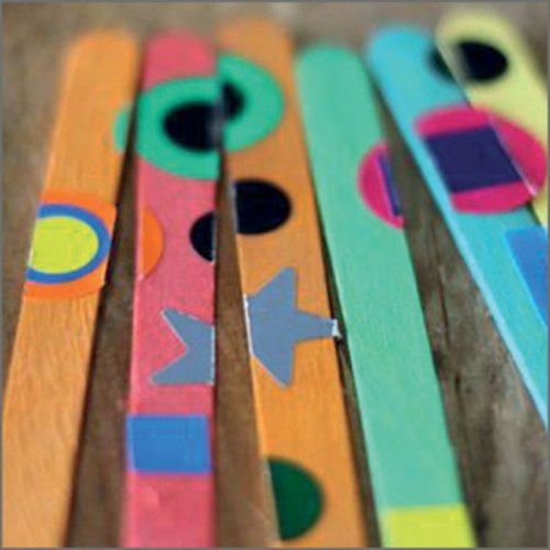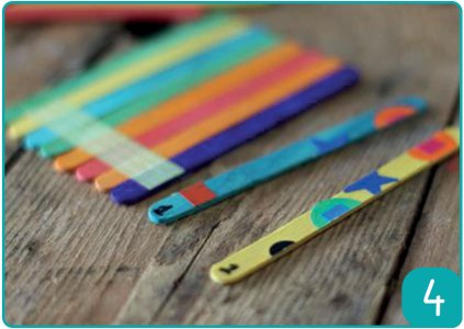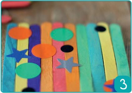 Etape 3 : Coller des gommettes entre les bâtonnets. Décorer selon ses propres envies.