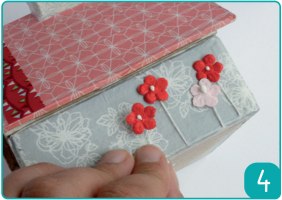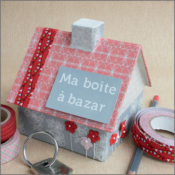 Etape 4 : Agrémenter le support avec du ruban tissu adhésif, des fleurs en papier. Peindre la plaque de bois en gris, écrire «boîte à bazar» puis la coller sur le toit.