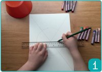 Etape 1 : Tracer un cercle au centre de la feuille. Diviser ensuite la feuille entière en médianes passant par le centre du cercle. Bien tracer les lignes d’un bord à l’autre de la feuille. Indiquer dans chaque zone ainsi formée au crayon graphite, la lettre C pour une couleur chaude et F pour une couleur froide, en commençant par les zones à l’intérieur du cercle central. Deux couleurs chaudes ou deux couleurs froides ne doivent jamais se toucher par une ligne commune. Elles auront uniquement un coin en commun.