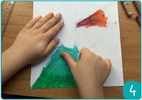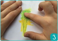 Etape 2 : Diviser les pastels en deux groupes : couleur chaude et couleur froide. Appairer ensuite les pastels 2 à 2 en choisissant deux teintes au dégradé harmonieux (jaune rouge/bleu vert). Faire la démonstration aux enfants de la façon dont on juxtapose deux couleurs jusqu’à les superposer au centre de la zone coloriée pour ainsi obtenir une troisième couleur par le mélange des deux premières. Il est possible de lisser avec l’index cette zone centrale pour un effet plus doux de dégradé estompé.