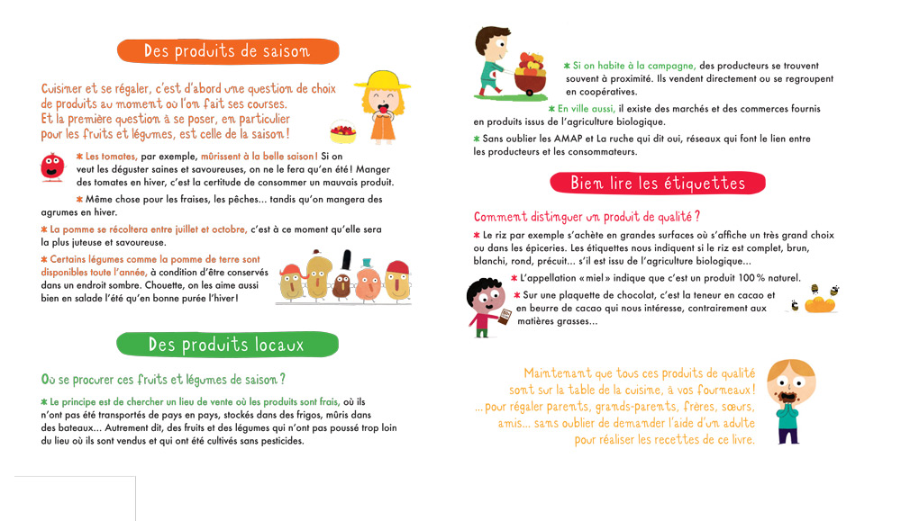 Comment choisir ses produits ? En décryptant les étiquettes et en consommant local si possible ! À chaque recette, une ardoise façon bistrot donne des indications au petit cuisinier en herbe.