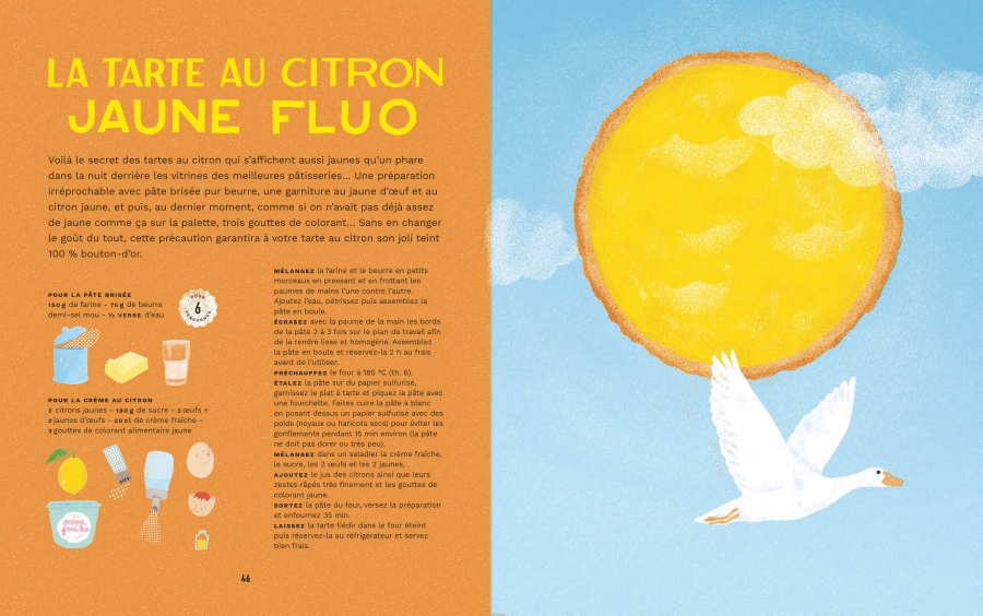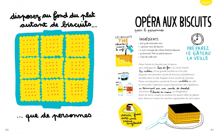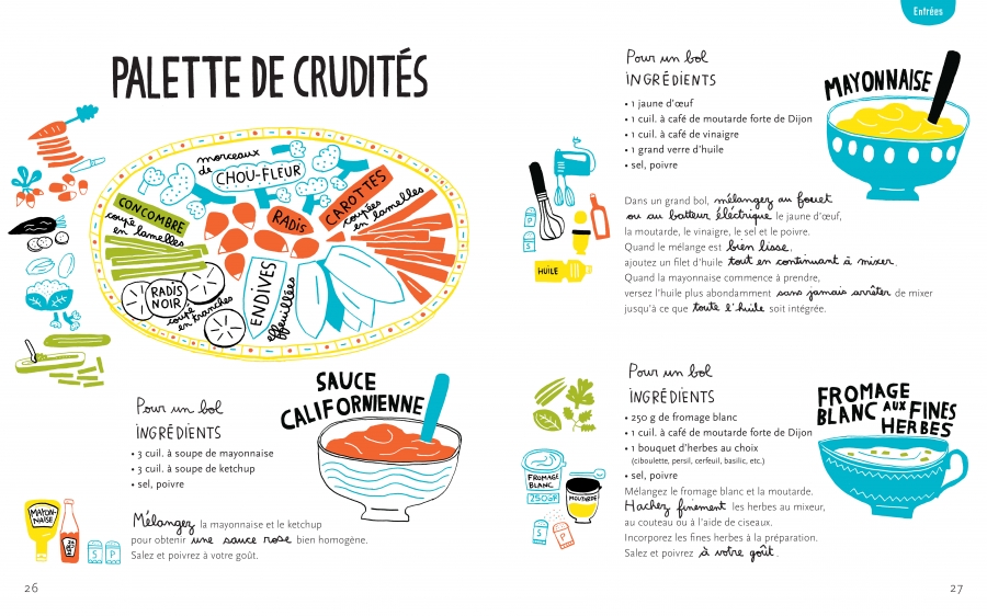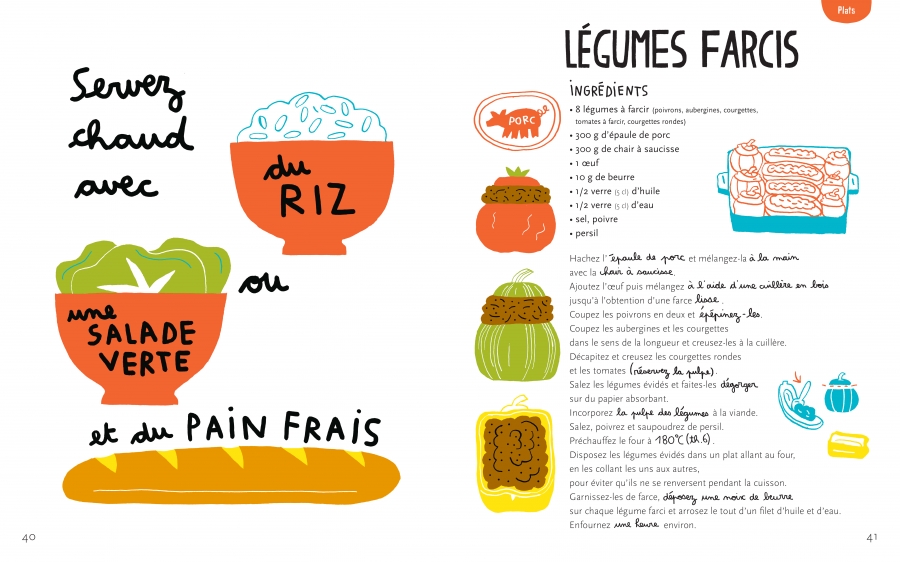 Structuré en trois parties (entrées, plats, desserts) faciles à repérer car associées à trois couleurs (bleu, rouge, jaune), ce grand livre est élaboré de manière à ce que l’enfant se repère seul. Drôles et attrayantes avec leurs couleurs vives, les illustrations présentent les recettes comme de véritables parties de plaisir : qui a dit qu’il ne fallait pas jouer avec la nourriture ?