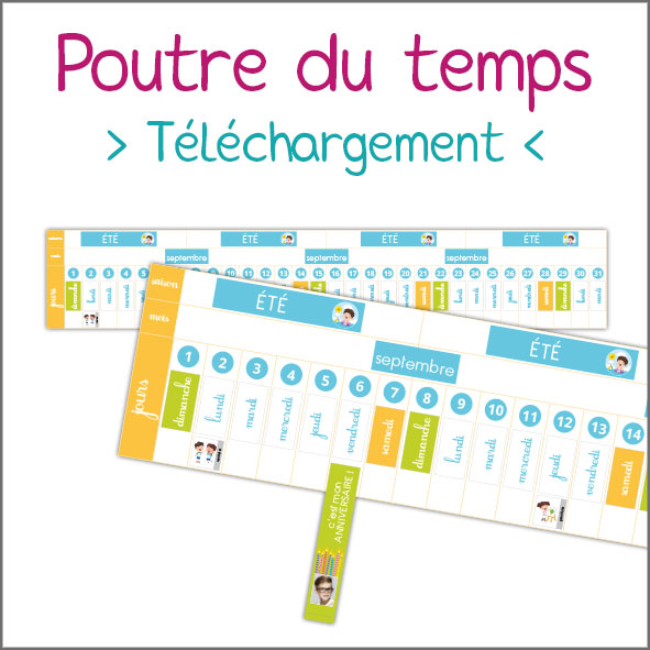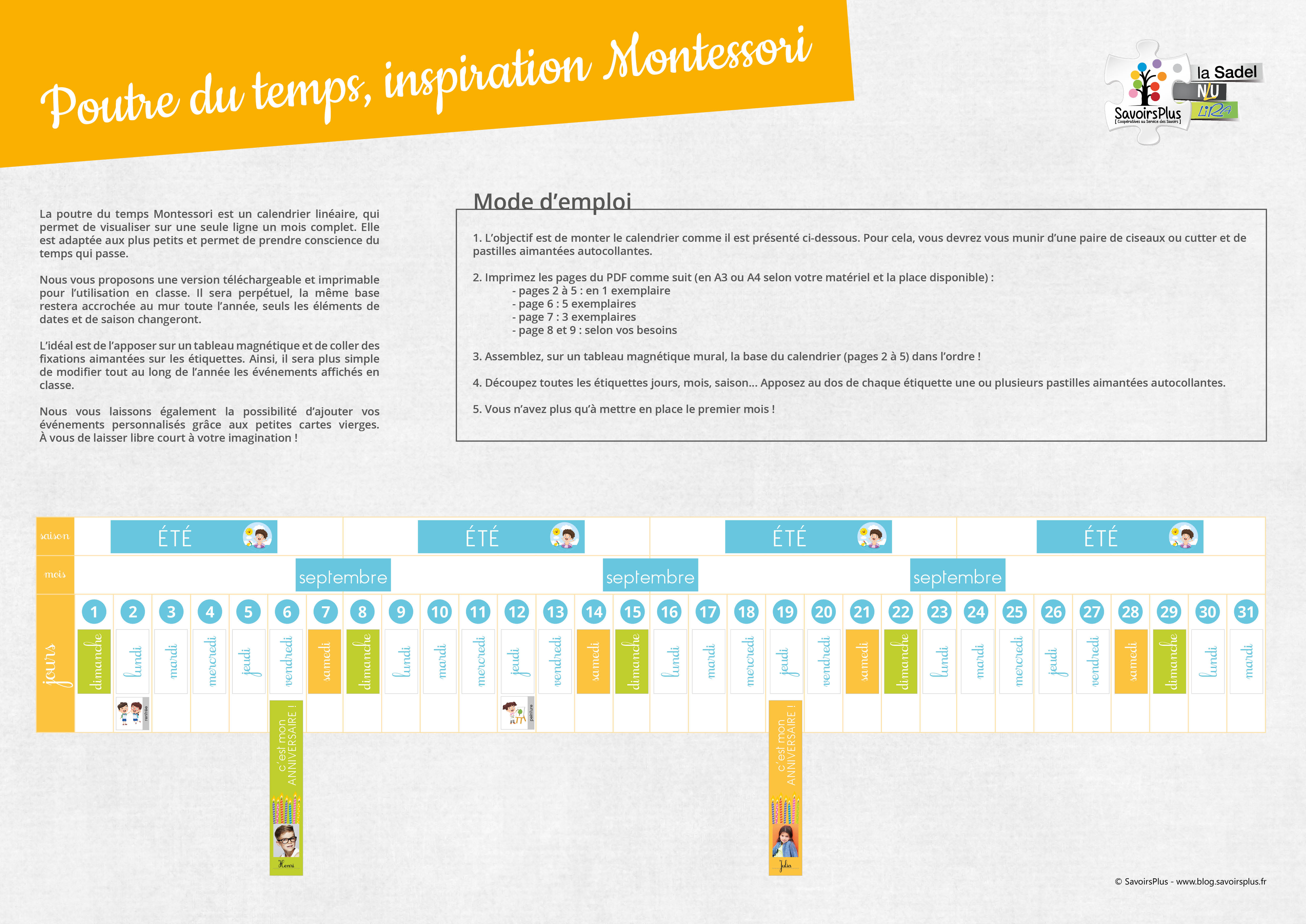 La poutre du temps Montessori est un calendrier linéaire, qui permet de visualiser sur une seule ligne un mois complet. Elle est adaptée aux plus petits et permet de prendre conscience du temps qui passe.