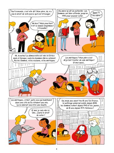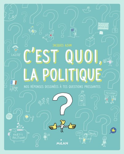 C’est quoi la politique ? Pourquoi le drapeau français est-il bleu-blanc-rouge ? C’est quoi la nationalité française ? C’est quoi une manifestation ? C’est quoi la laïcité ? À quoi sert le Sénat ? À quoi sert un président de la République ? Quel est le travail du ministre de la Justice ? Qui était Jean Jaurès ? Pourquoi on a créé l’Europe ? En 4 grandes parties (Les valeurs et les symboles de la République, Les acteurs de la République, L’organisation du territoire, La France dans l’Europe) l’ouvrage décrypte ce qu’est la politique aux plus jeunes. Les pages sont découpées en strips croqués par Jacques Azam et les textes sont adaptés aux plus jeunes, et remis en perspective grâce à des pages repères dans lesquelles l’infographie domine.
