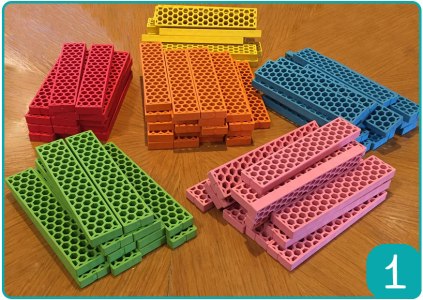 Sortir les briques Bioblos de leur boite. Regrouper les enfants par 6. Il y a 6 couleurs de Bioblo. Attribuer une couleur à chaque enfant du groupe, par exemple en lui donnant un premier Bioblo de cette couleur. Chaque enfant complète un lot de 10 briques de sa couleur et le pose dans la zone de son groupe.