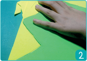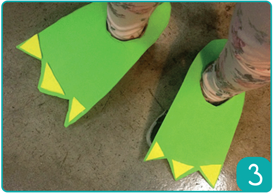 Etape 1 : Dessiner et découper la forme d’un pied de dinosaure. La taille dépendra de celle du pied de l’enfant ! Astuce : lui demander de mettre son pied sur la mousse pour marquer la largeur et le trou où le pied devra passer.