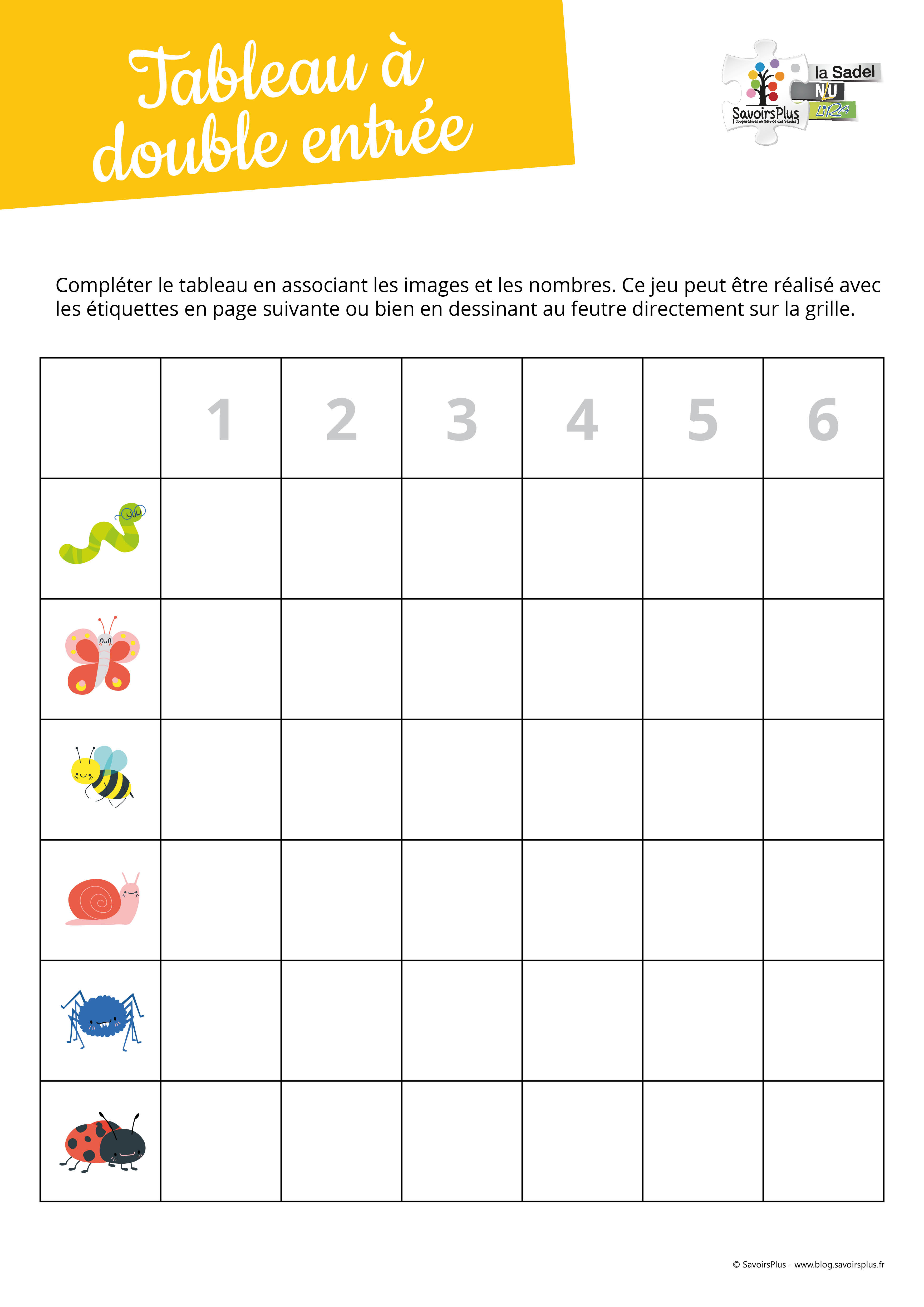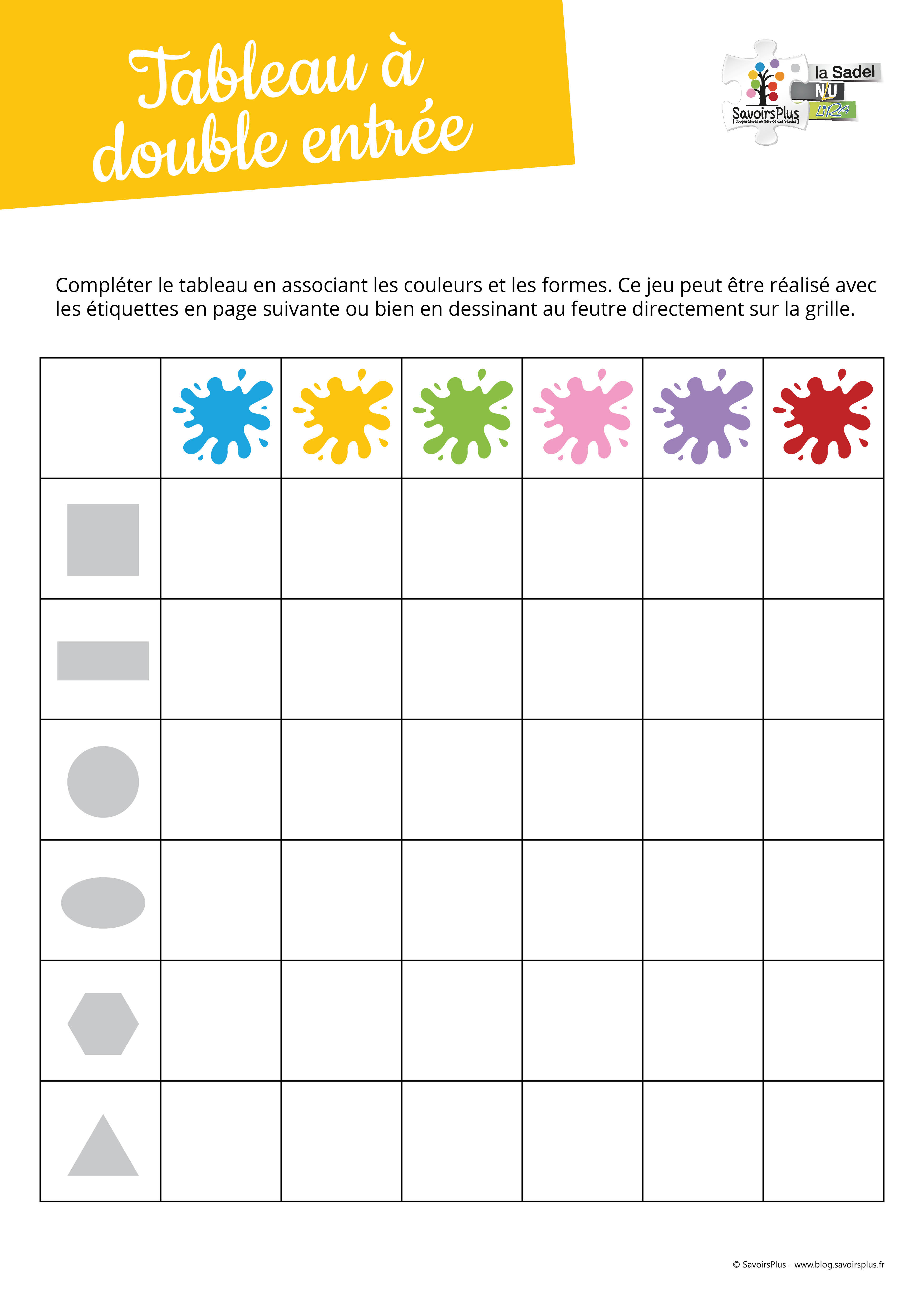 Compléter le tableau en associant les informations horizontales et verticales. Ce jeu peut être réalisé avec les étiquettes fournies dans le fichier ou bien en dessinant au feutre directement sur la grille.