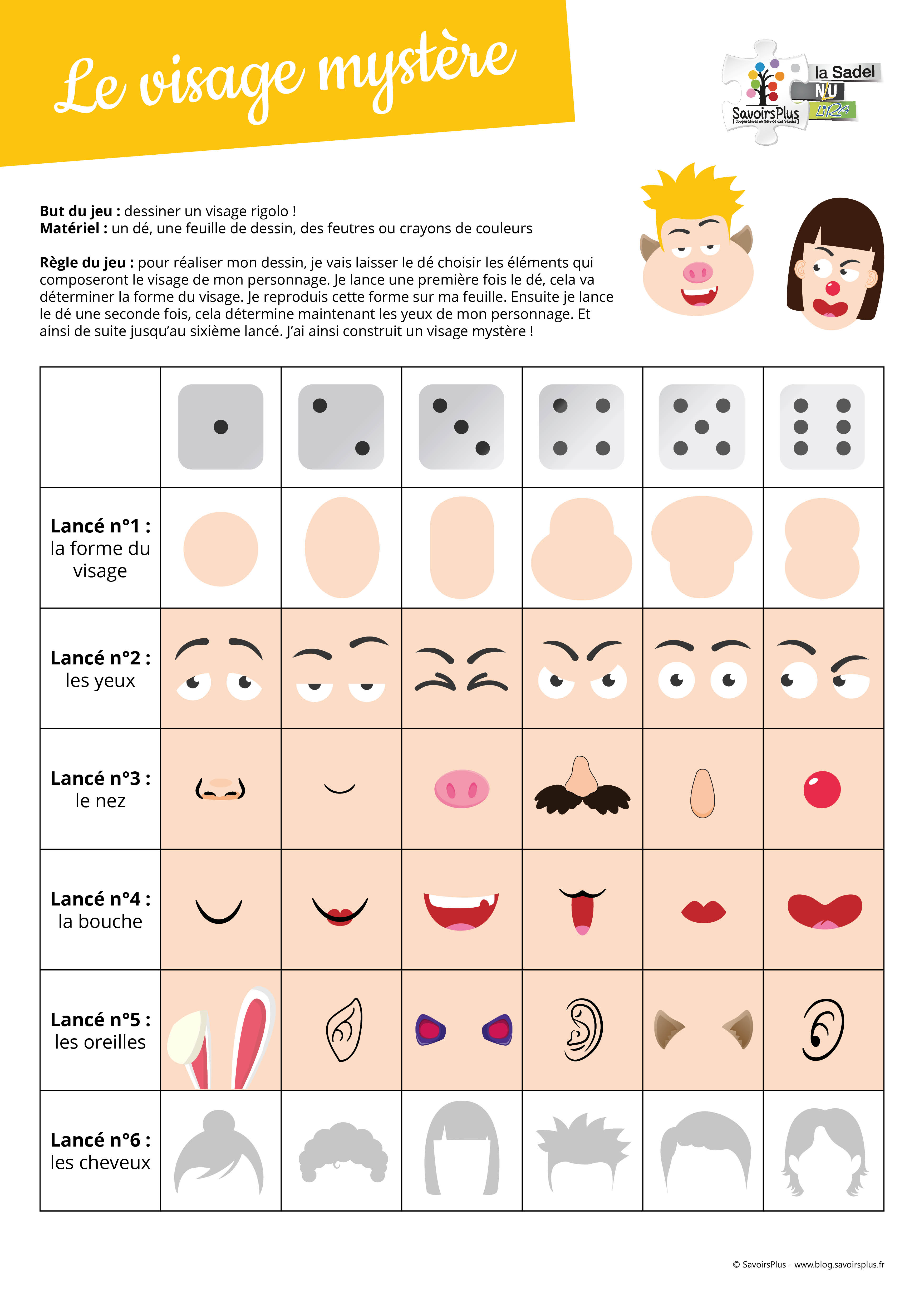 Règle du jeu : pour réaliser mon dessin, je vais laisser le dé choisir les éléments qui composeront le visage de mon personnage. Je lance une première fois le dé, cela va déterminer la forme du visage. Je reproduis cette forme sur ma feuille. Ensuite je lance le dé une seconde fois, cela détermine maintenant les yeux de mon personnage. Et ainsi de suite jusqu’au sixième lancé. J’ai ainsi construit un visage mystère !