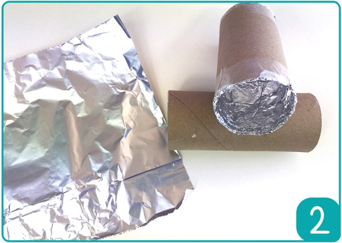 Etape 2 : Tapisser l’intérieur du deuxième rouleau de carton avec le papier aluminium et le fixer sur le dessus du rouleau avec du ruban adhésif.