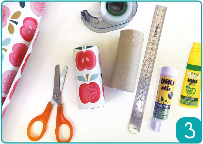 Etape 3 : Recouvrir les 2 rouleaux avec du joli papier coloré à l’aide de la colle.