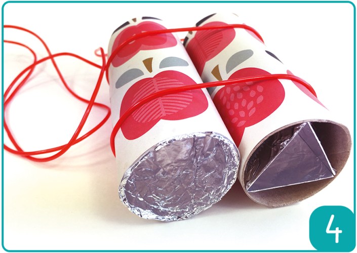 Etape 4 : Assembler les 2 rouleaux à l’aide du fil de scoubidou (ainsi il est possible de les utiliser ensemble ou indépendamment) et nouer le fil de scoubidou pour en faire une lanière de cou. Les jumelles magiques sont prêtes !