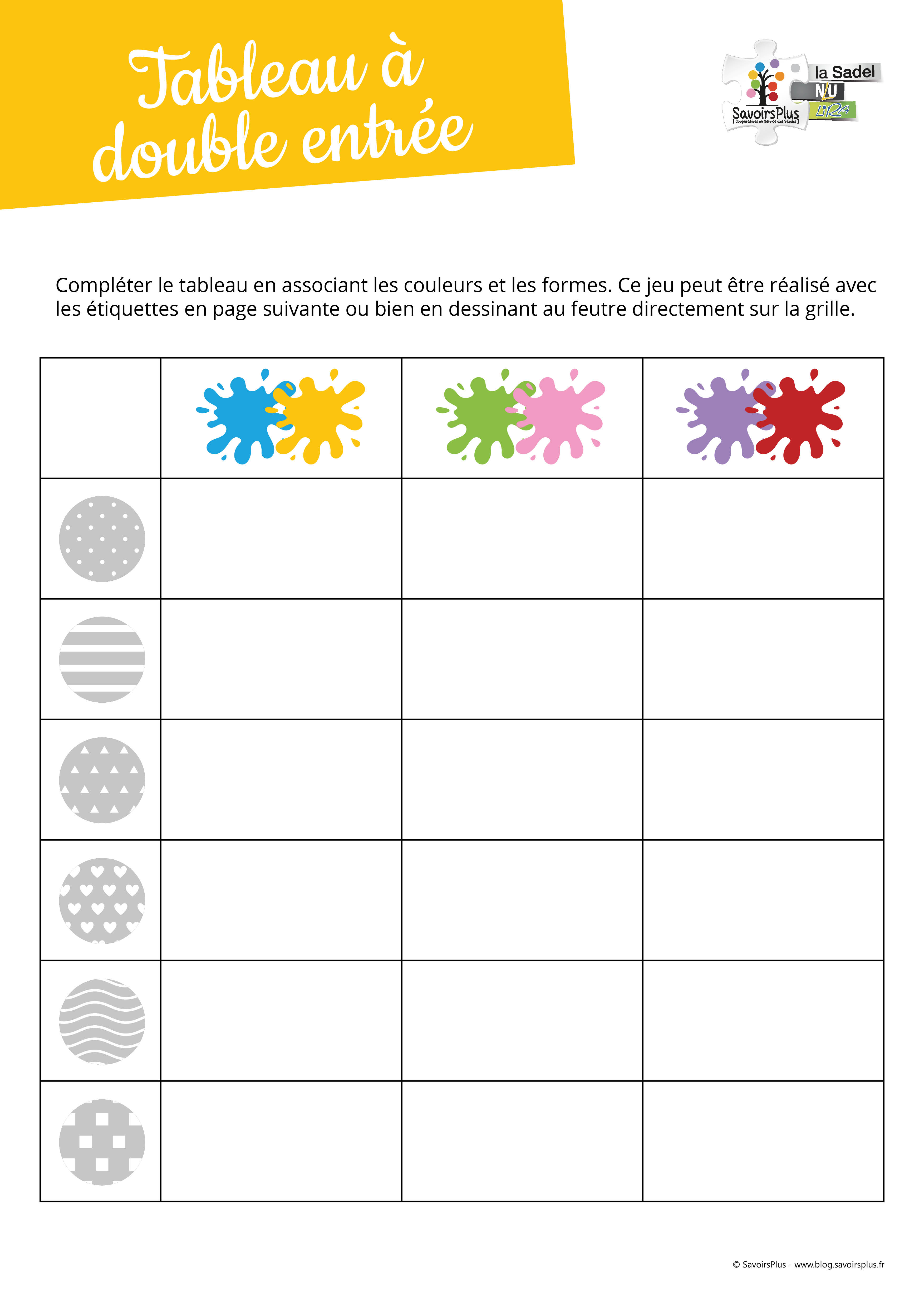 Compléter le tableau en associant les informations horizontales et verticales. Ce jeu peut être réalisé avec les étiquettes fournies dans le fichier ou bien en dessinant au feutre directement sur la grille.
