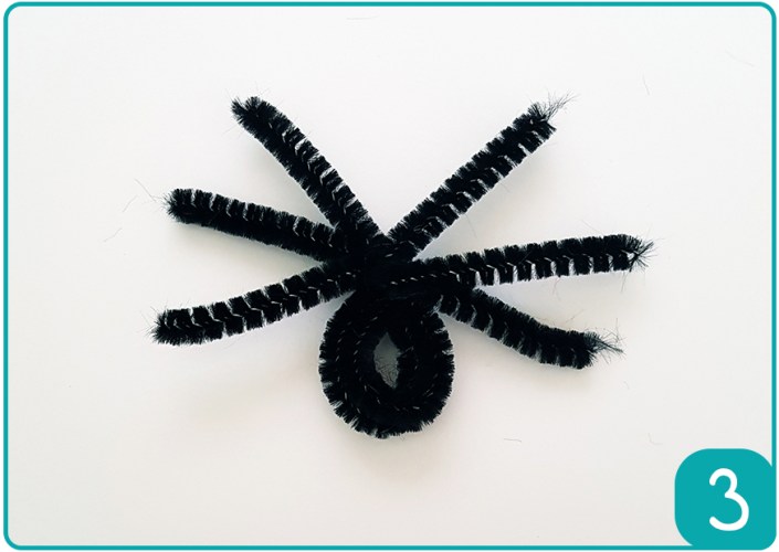 Etape 3 : Tournicoter les brins pour fixer la boucle. Ecarter les pattes autour du corps de l’araignée.
