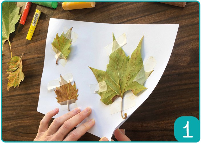 Etape 1 : Prendre une feuille de papier blanc. Coller des feuilles d’automne au rouleau adhésif sur l’une des faces.