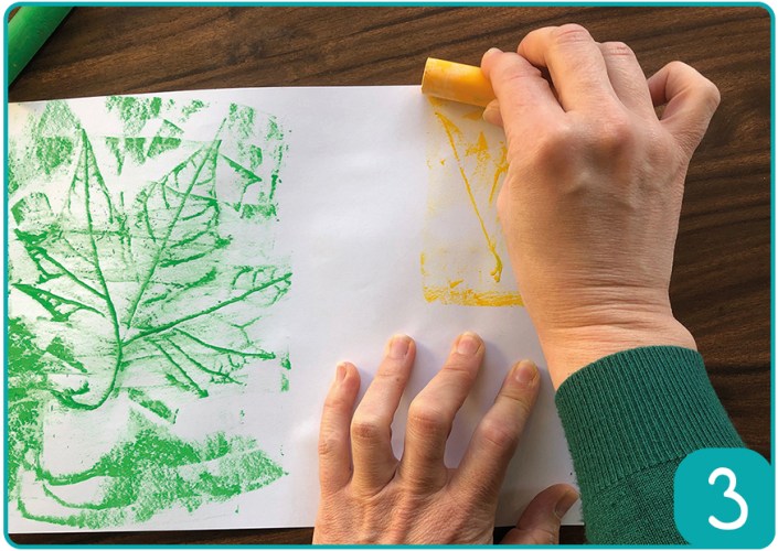 Etape 3 : Maintenir la feuille d’une main et passer un pastel en position horizontale, sur la tranche, sur la feuille tout en mettant une pression suffisante pour voir apparaître les motifs de la feuille. Répéter le geste plusieurs fois pour bien faire apparaître le motif.