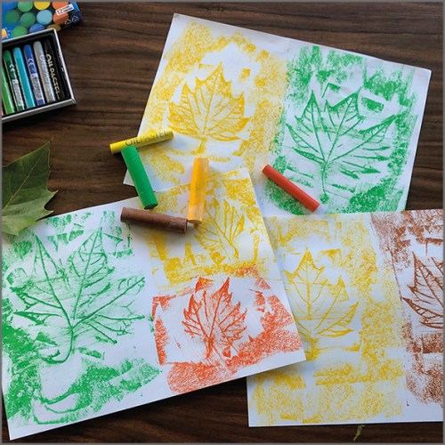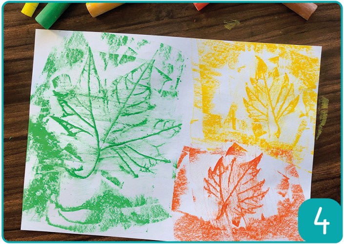 Etape 4 : Répéter l’étape 3 avec différentes feuilles d’automne et différentes couleurs de pastels.