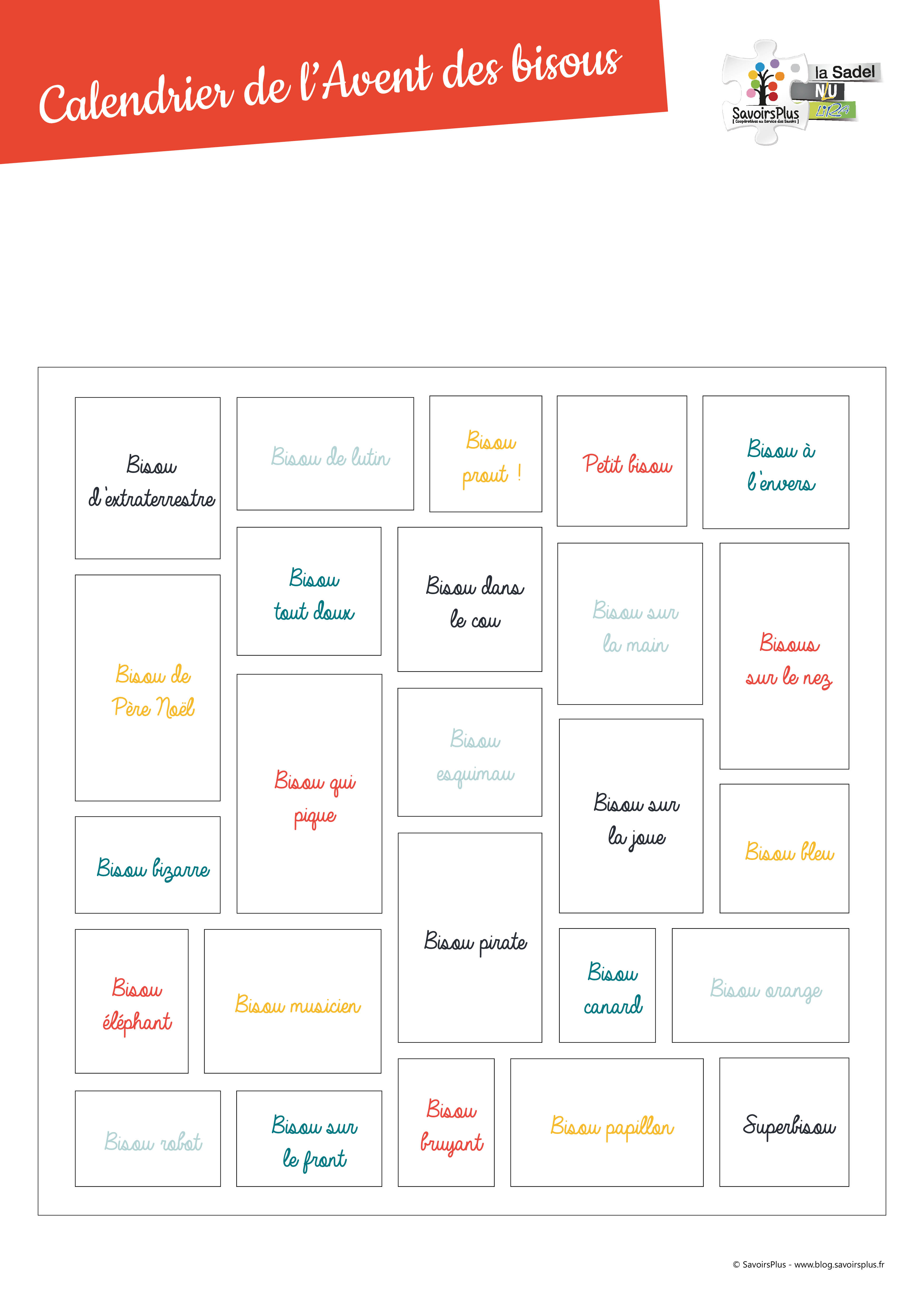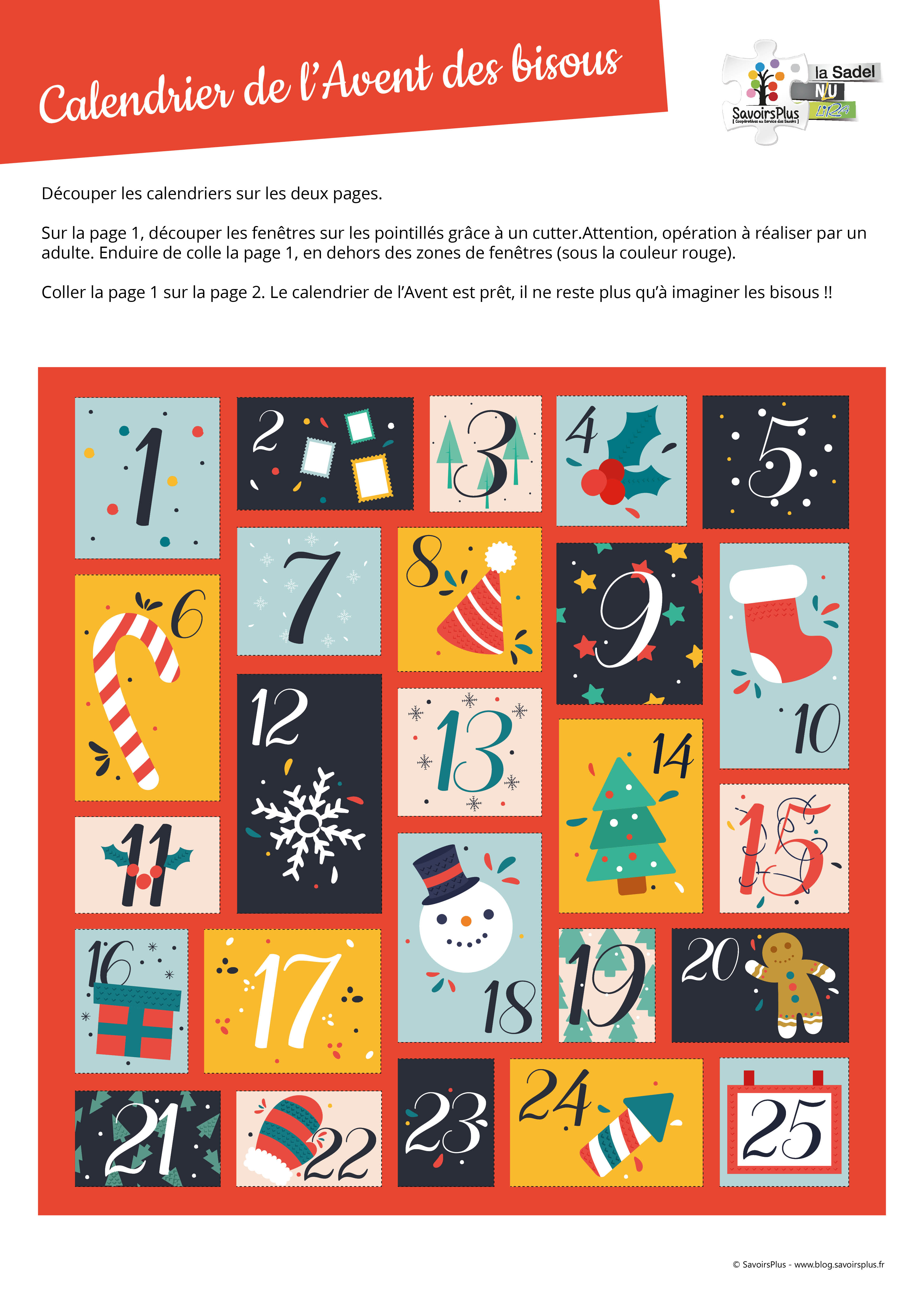 Télécharger et imprimer le document sur du papier épais. Couper les deux carrés correspondants à la partir avant et arrière du calendrier. Sur la page 1, couper sur les pointillés chaque ouverture au cutter (haut, bas et droite). Attention, n’ouvrez pas les cases car sinon le pli sera fait. Sur la page 2, enduire de colle autour des carrés « Bisous ». Poser la page 1 sur la page 2 pour qu’elles soient bien alignées. La calendrier est prêt à être utilisé !