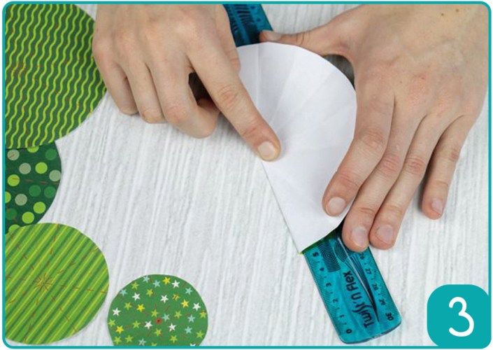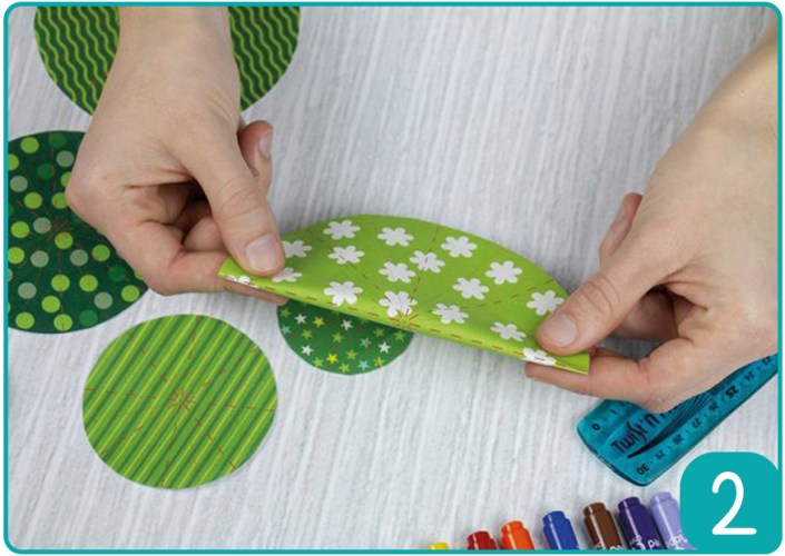 Etape 2 : Découper et plier les cercles pour construire le sapin. Commencer par plier les pointillés « tirets » sur la face recto. Effectuer cette action pour l’ensemble des pointillés « tirets » et pour chaque cercle.