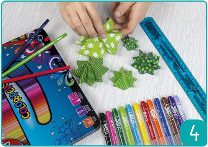 Etape 4 : Tous les ronds sont pliés. Vérifier qu’ils ont tous la forme attendue. Si ce n’est pas le cas, accentuer le pliage pour avoir « l’effet » sapin. Pour créer le sapin, empiler l’ensemble des éléments : le plus gros en bas, le plus petit en haut.