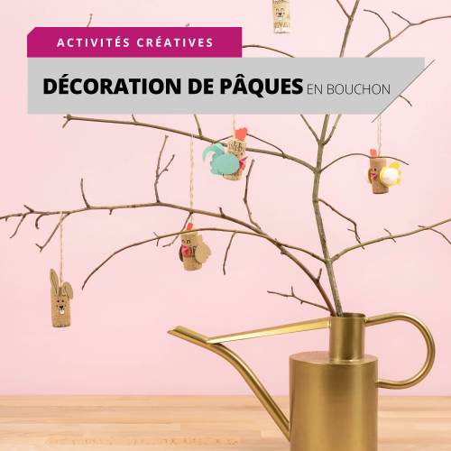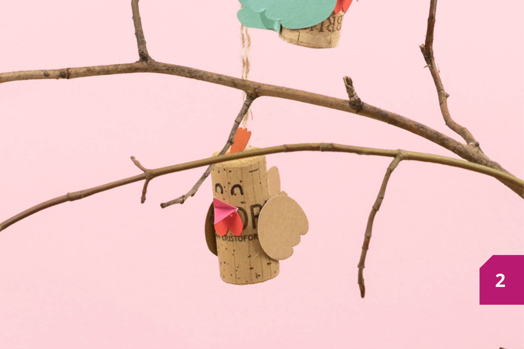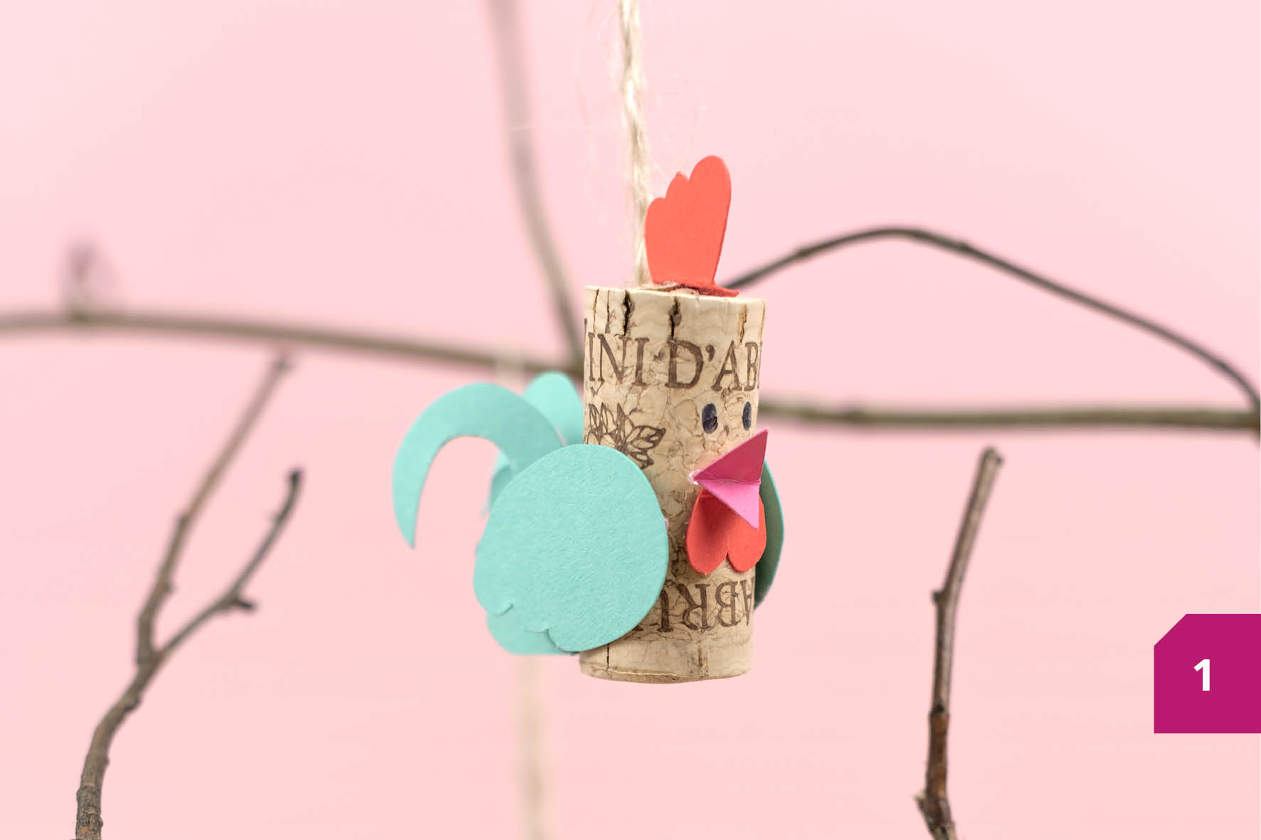 Etape 4 : Utiliser l’aiguille pour faire un petit trou sur le dessus du bouchon. Couper un morceau de ficelle. Utiliser l’aiguille pour pousser la ficelle à l’intérieur du trou. Fixer avec de la colle en pistolet.
