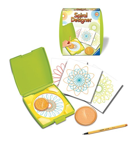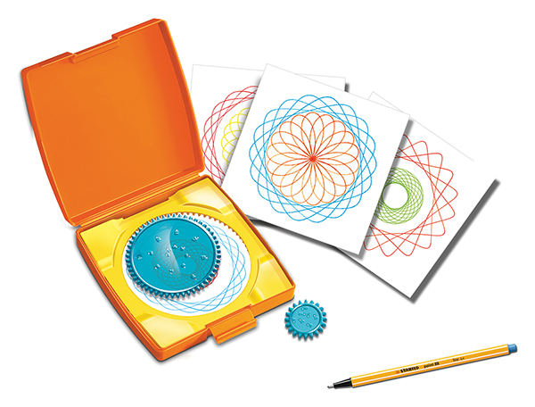 Réalisez de belles spirales géométriques grâce aux différentes roues crantées fournies dans ce Spiral designer. Après avoir inséré une feuille de papier dans le support et choisi une des roues crantées, il n’y aura plus qu’à tourner pour créer une infinité de motifs.