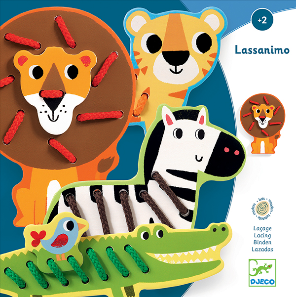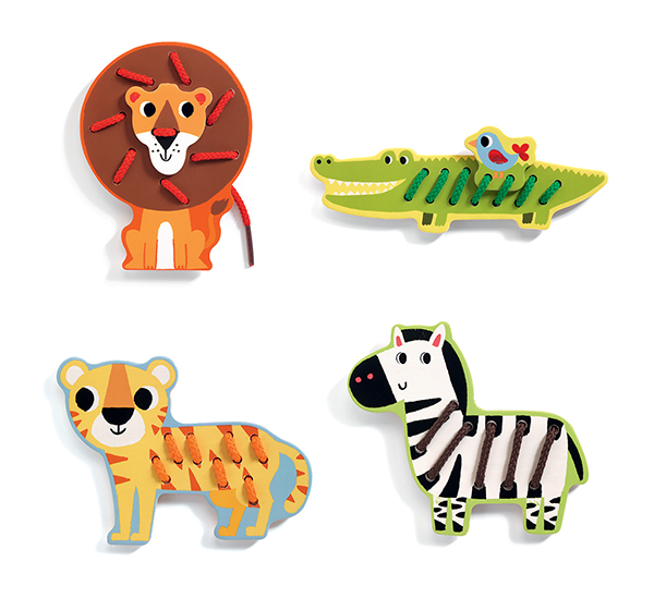 Un jeu de laçage sur le thème des animaux de la savane pour développer la motricité fine. Il faudra venir compléter le pelage des 4 animaux à l’aide des lacets colorés et reconstituer les 2 parties du lion et fixer l’oiseau sur le crocodile.