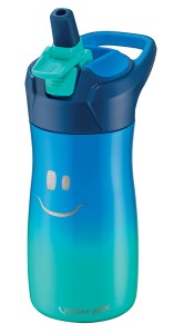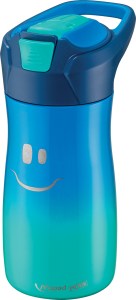 Gourde en acier inoxydable, simple paroi (corps). Ouverture automatique facile et rapide en appuyant sur le bouton. Bouton de blocage empêchant l’ouverture dans le sac. Pratique à transporter grâce à sa poignée intégrée. Nettoyage facile : lave-vaisselle pour le goulot et éponge pour le corps. Coloris bleu. Hauteur : 17 cm.