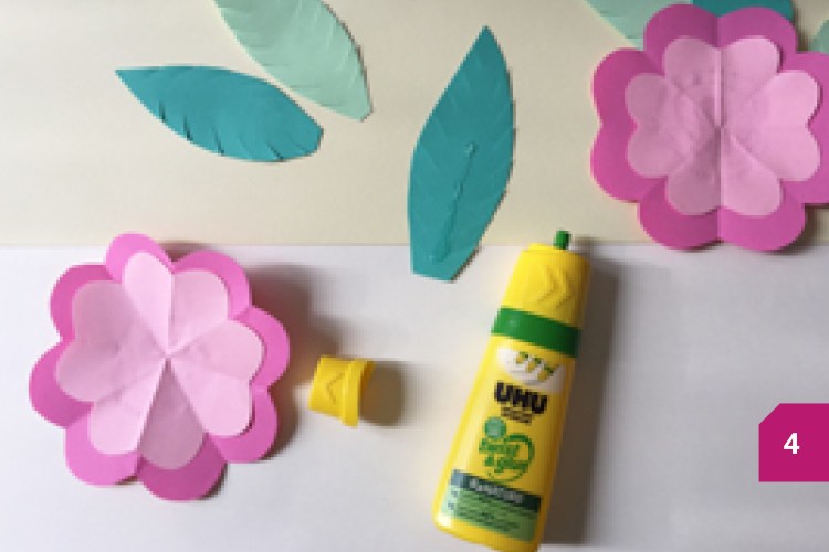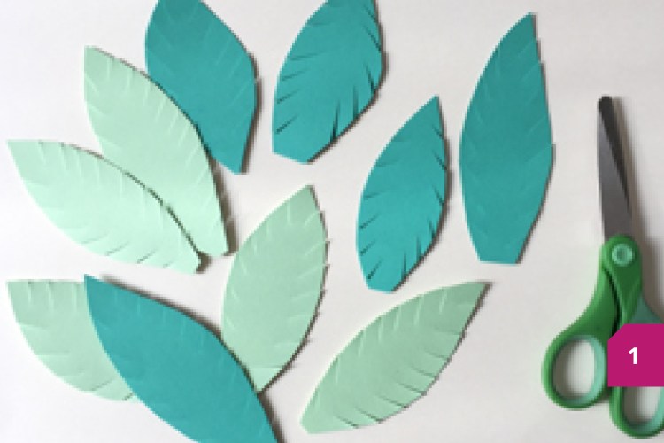 Etape 1 : Découper la feuille A4 en deux bandes égales et coller le centre avec UHU Twist & Glue. Dessiner puis découper différentes feuilles vertes.