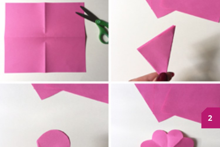 Etape 2 : Plier un carré de papier en 4, puis en deux pour obtenir un triangle, découper ensuite une extrémité en arrondi, déplier pour obtenir votre fleur.