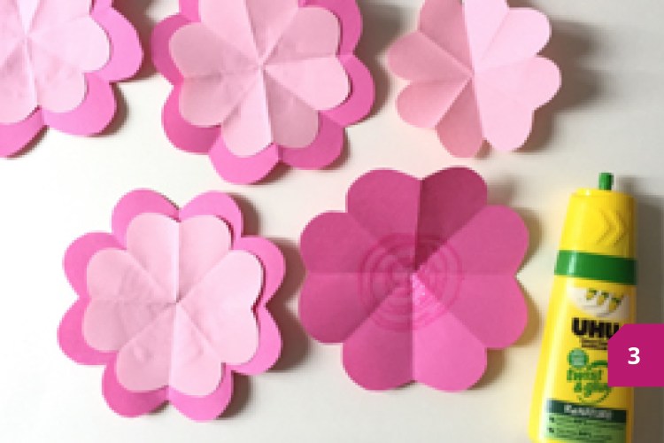 Etape 3 : Reproduire l’opération 3 pour avoir 3 grandes fleurs et 3 petites, puis les coller ensemble.