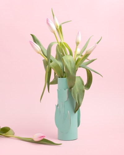 Etape 2 : Enrouler le papier épais de couleur autour de la bouteille et marquer le chevauchement du papier. Couper la bande à la longueur indiquée. Faire de même avec le papier blanc. Transférer le modèle de tulipe sur le papier coloré.