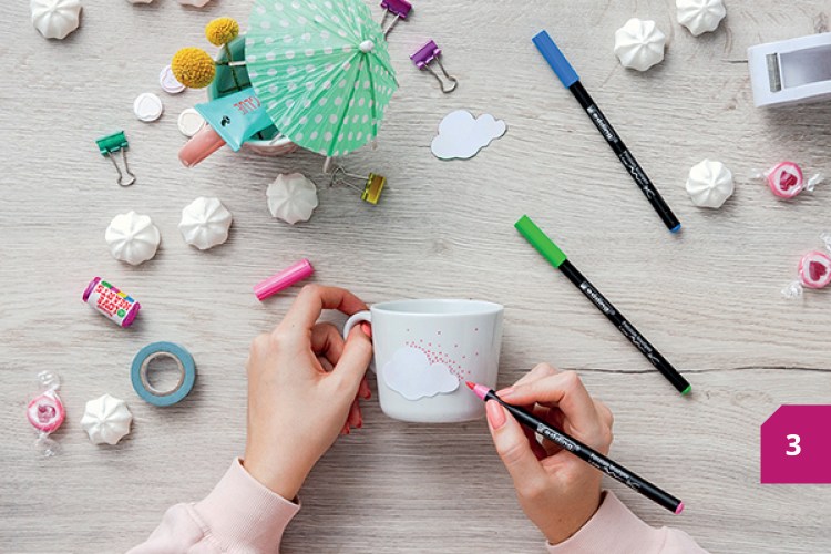 Etape 3 : La pointe très souple du feutre pointe pinceau pour porcelaine permet de tracer des traits fins et des points (avec l’extrémité de la pointe), ainsi que des traits plus épais (en tenant le feutre plus penché). Avec le feutre rose, dessiner autour du nuage, une multitude de petits points tout près les uns des autres. Une erreur peut être effacée avec un chiffon humide ou un coton-tige.