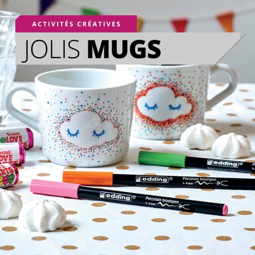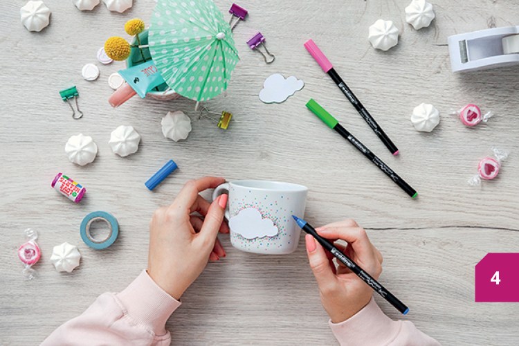 Etape 4 : Ajouter ensuite des petits points de couleur bleu et vert. Faire en sorte qu’ils soient très denses pour que la forme du nuage ressorte et soit facilement reconnaissable. Pour finir, décoller le papier en forme de nuage et dessiner deux yeux endormis sur la forme de nuage sur le mug. Une fois le décor prêt, le laisser sécher 15 minutes. Préchauffer votre four à 160° et placer les mugs décorés sur une grille de four froide. Faire cuire pendant 25 minutes et laisser refroidir dans le four. Une fois refroidi, vous pouvez sortir vos mugs et les utiliser. Lavage au lave-vaisselle possible (maximum 50°).