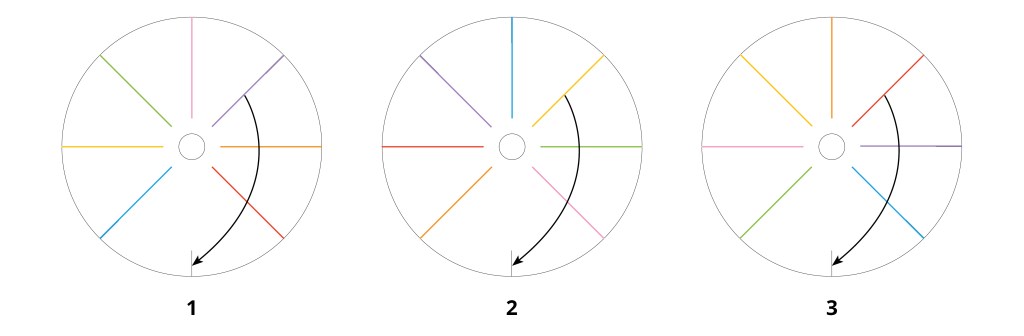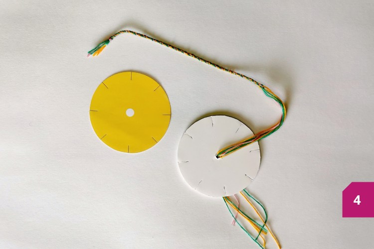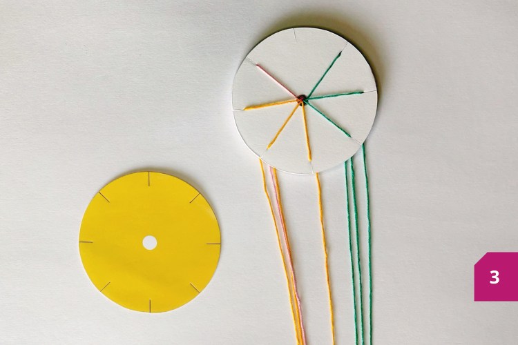 Etape 3 : Insérer les fils dans le trou au centre, côté nœud. Insérer les 7 fils dans les encoches autour du cercle de carton plume. Commencer maintenant le tissage. Tenir le cercle d’une main, l’encoche vide vers le bas. Compter 3 encoches vers la droite et se saisir du fil en troisième position. Insérer ce dernier dans l’encoche vide. Tourner le cercle pour repositionner l’encoche vide vers le bas. Compter 3 encoches vers la droite et se saisir du fil en troisième position. Insérer ce dernier dans l’encoche vide. Et ainsi de suite…