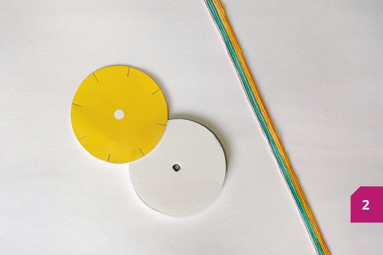 Etape 2 : Découper le rond de carton plume avec un cutter. Couper les 8 encoches et percer le centre. Rassembler les 7 fils et faire un nœud à une extrémité.